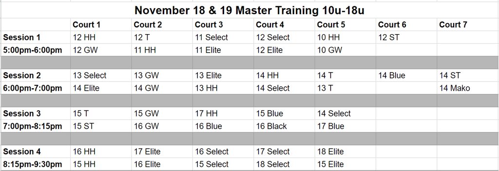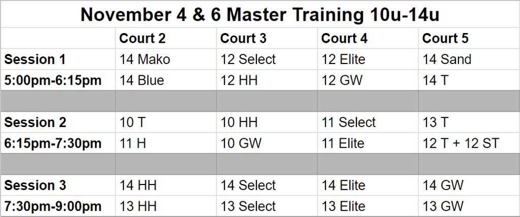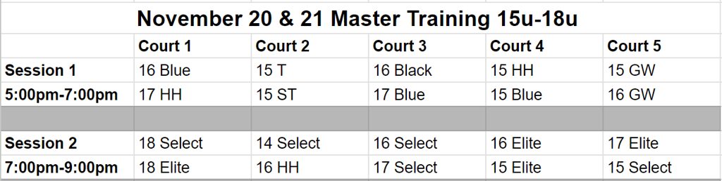 The dates for Master Training are shared in advance of tryouts so families can mark their calendars. However, the session times and court assignments for each team are only able to be created and shared after tryouts due to the schedule being based on the teams formed at tryouts. Younger teams are typically in the earlier sessions (before 7:00pm) and older teams are typically in the later sessions (after 6:00pm). The schedule, court assignments, and team pairings change throughout Master Training along with the skills focused on each day.